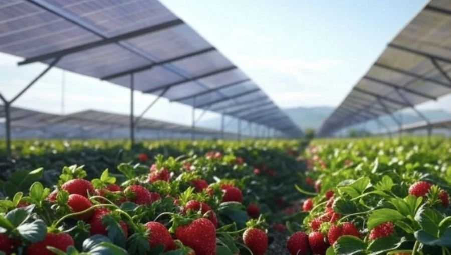 Strawberries under solar panels. Photo courtesy of SolarVision.